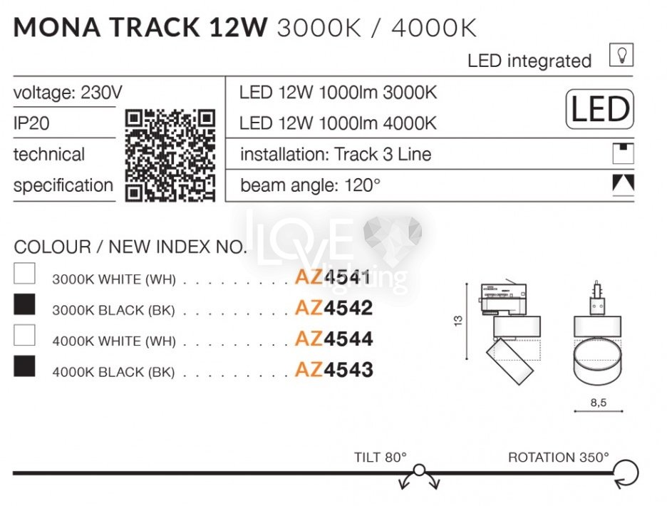 Lampa reflektor spot szynowa LED 12W MONA TRACK 3LINE AZ4544 Azzardo