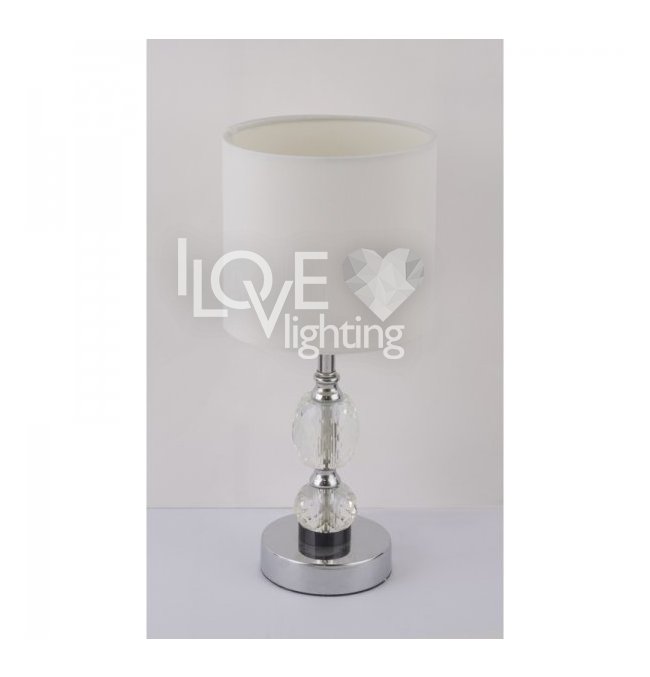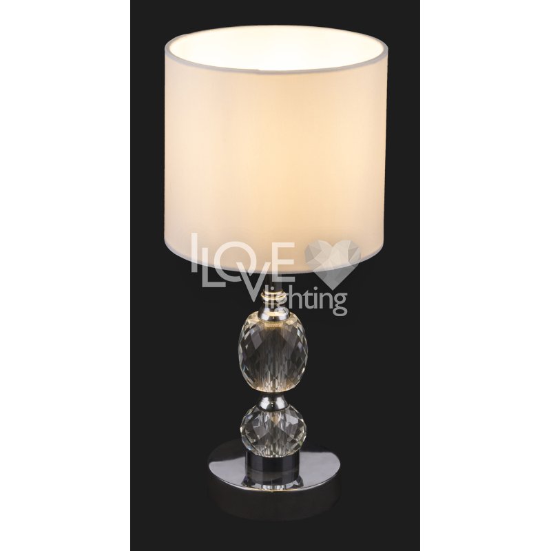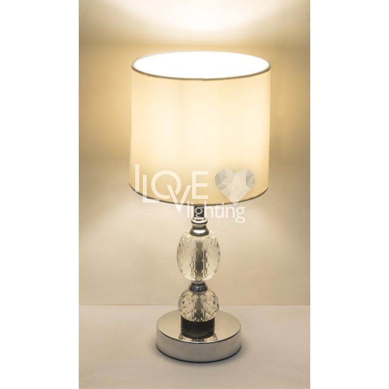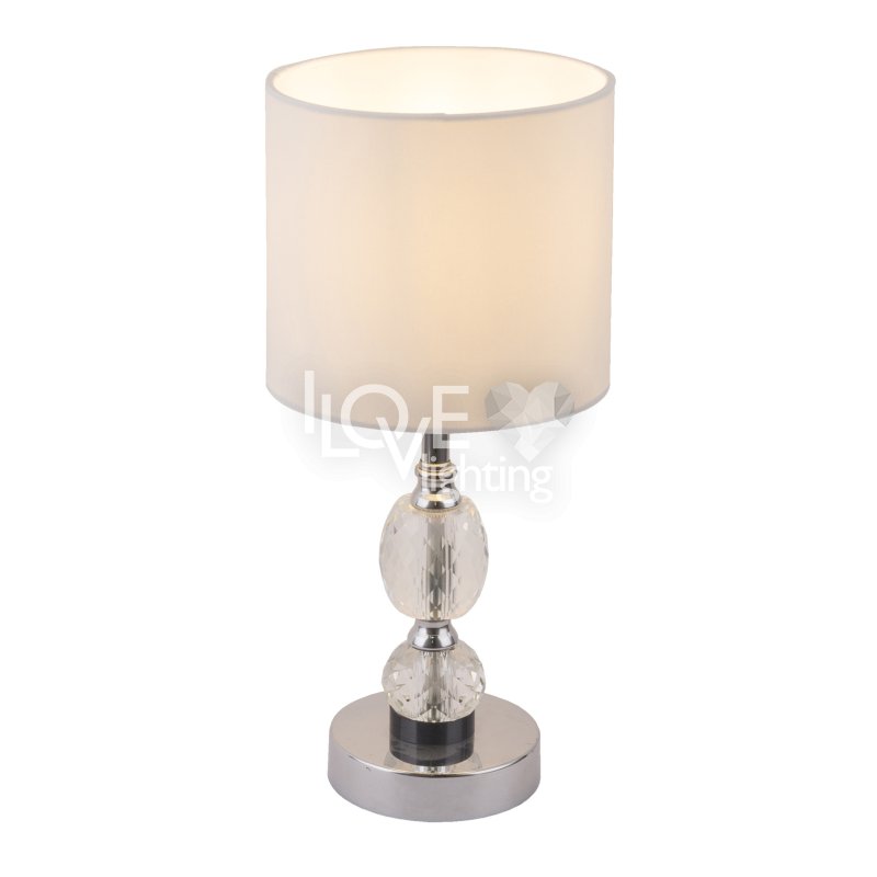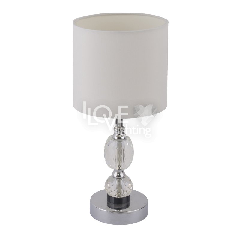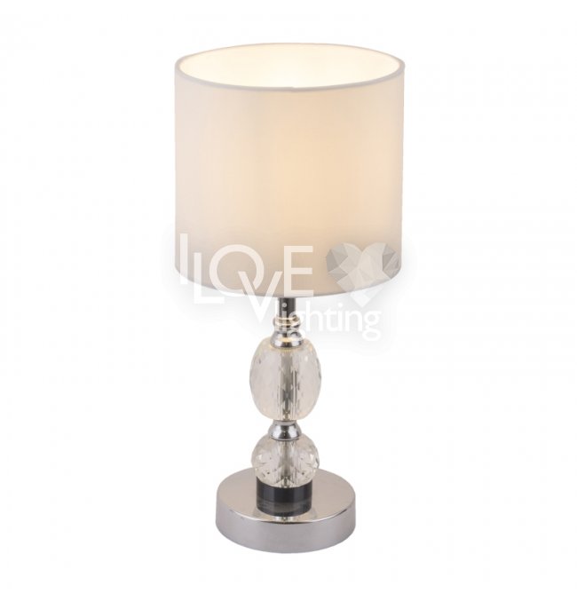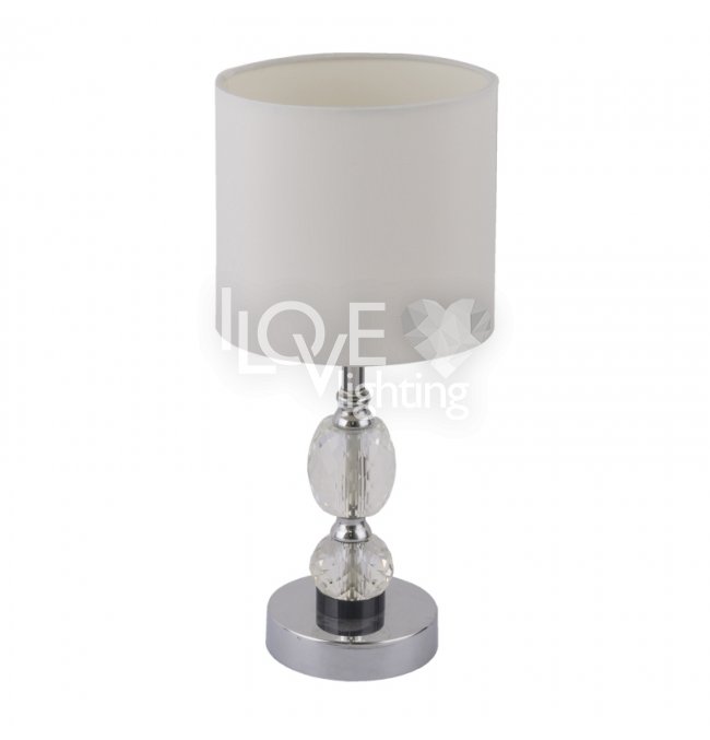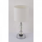 Lampka stołowa, chrom, tkanina biała, szkło kryształowe czyste, z wyłączinkiem, Szer:210, Wys:470mm, 1xE14 40W 230V
