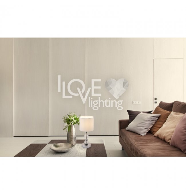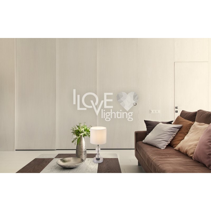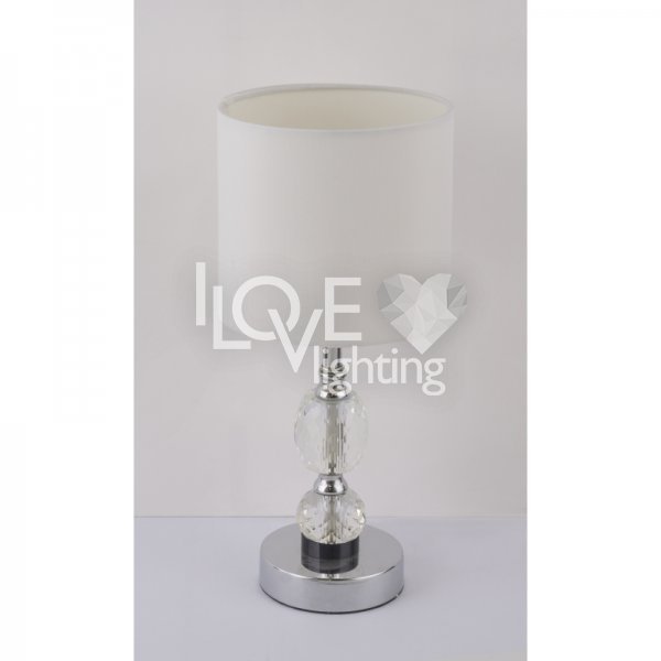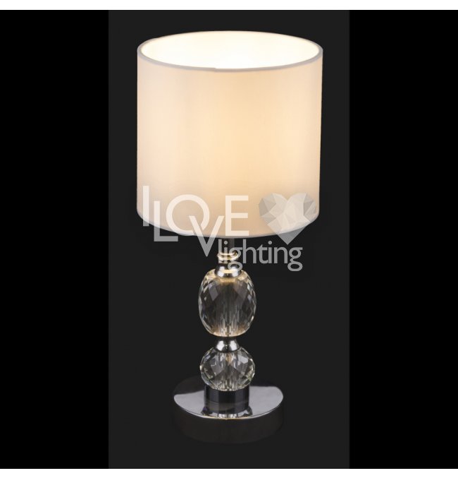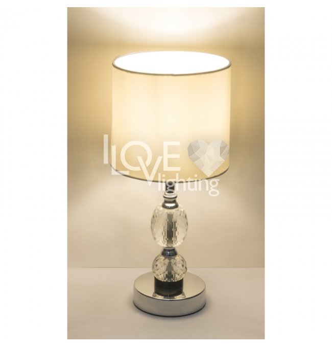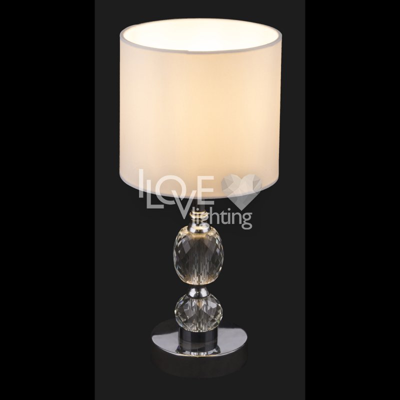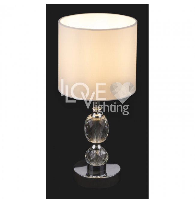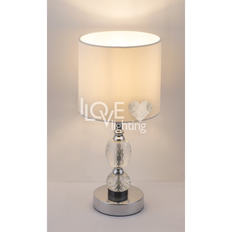 Lampka stołowa, chrom, tkanina biała, szkło kryształowe czyste, z wyłączinkiem, Szer:210, Wys:470mm, 1xE14 40W 230V