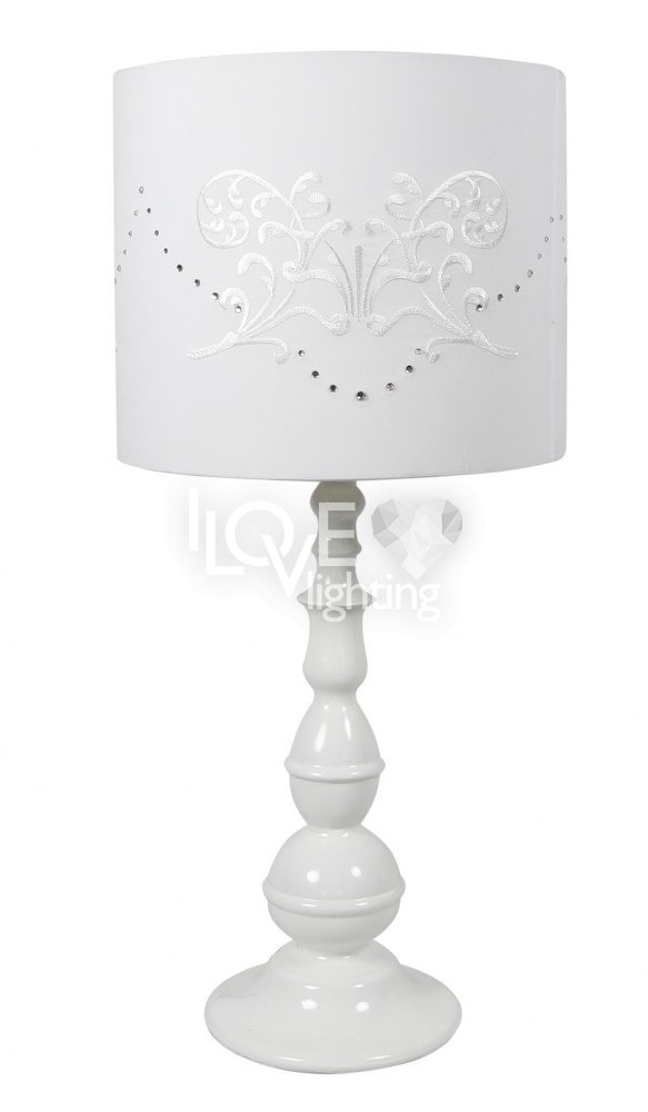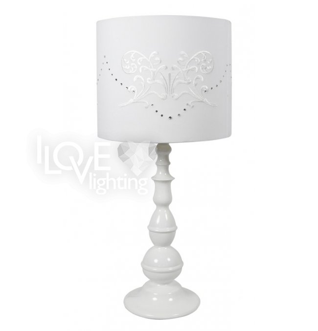biała kolorystyka abażuru w połączeniu z ozdobną metalową podstawą; zestaw do doświetlania stonowanych klasycznych pomieszczeń