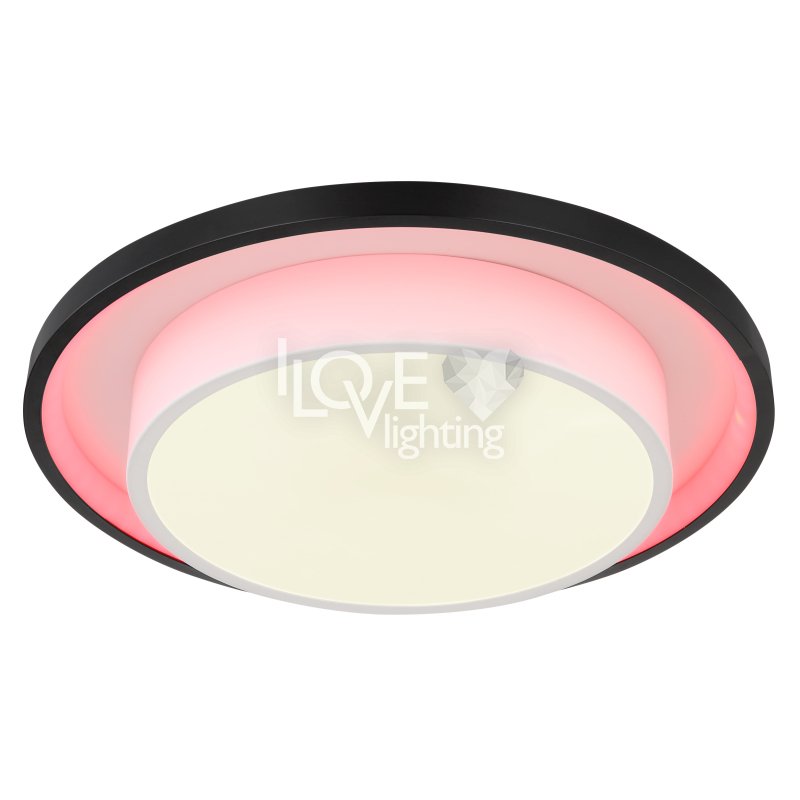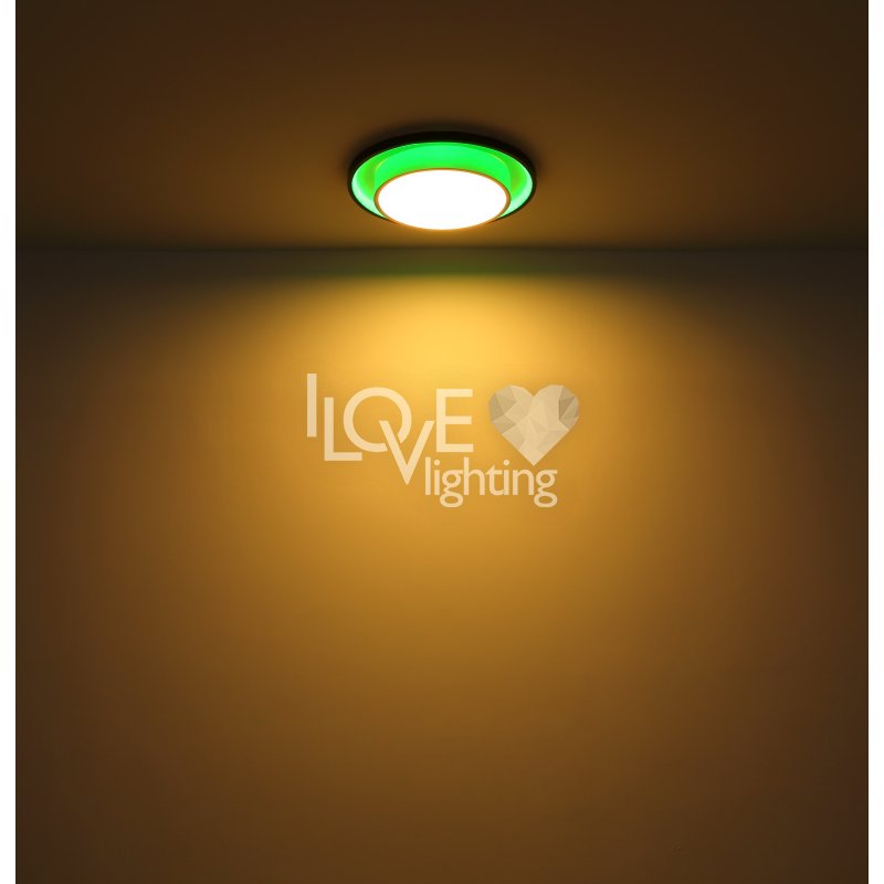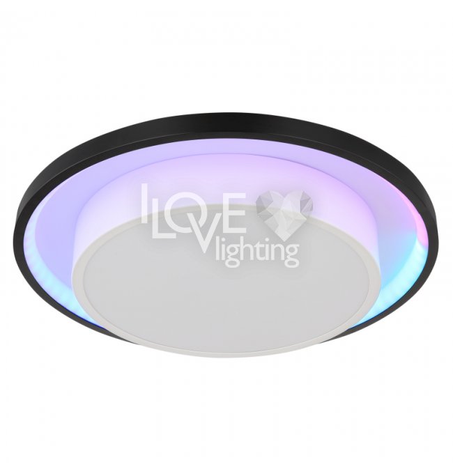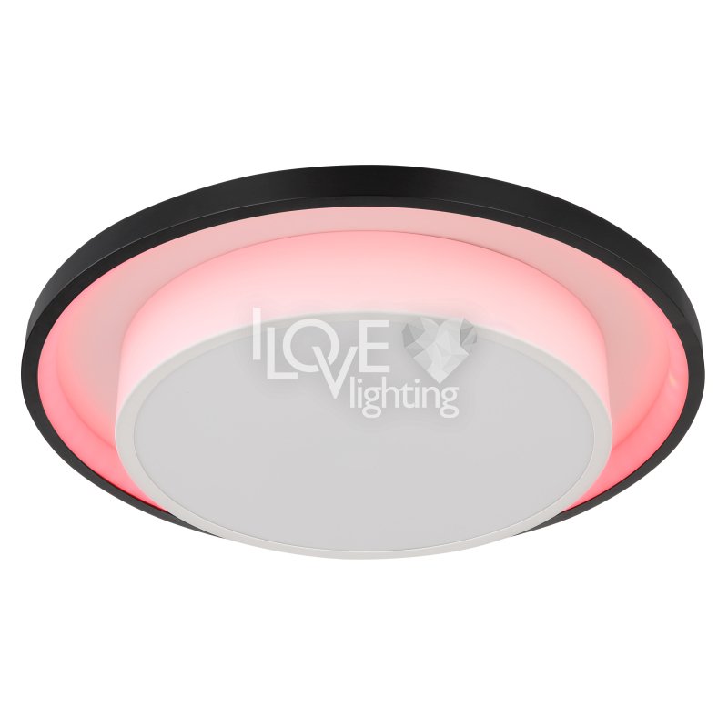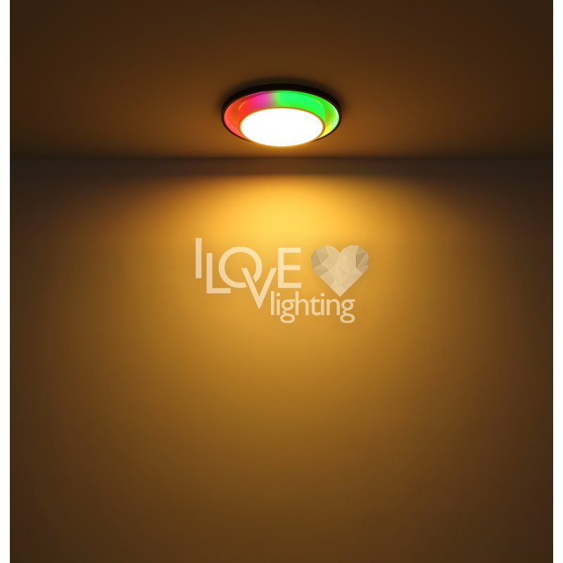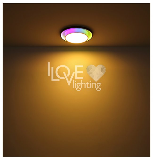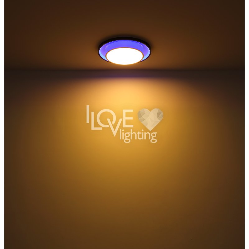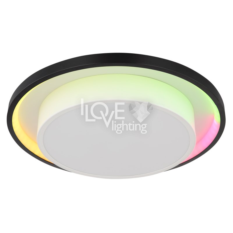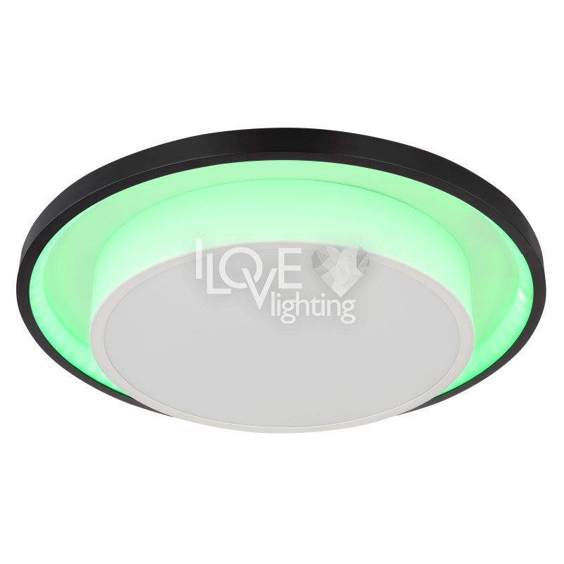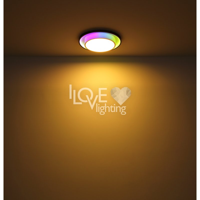 Lampa sufitowa LED, metal czarny mat, akryl opal, ściemniacz, regulacja z wyłacznika ściennego, RGB, pilot, pamieć ustaiweń, efekt tęczy, ?: 395mm, Wys: 50mm, zaw. LED 21W 230V, 210-2120lm źródło, 90-900lm wyj, CCT 2700-6500K, zaw. RGB LED 3W 230V