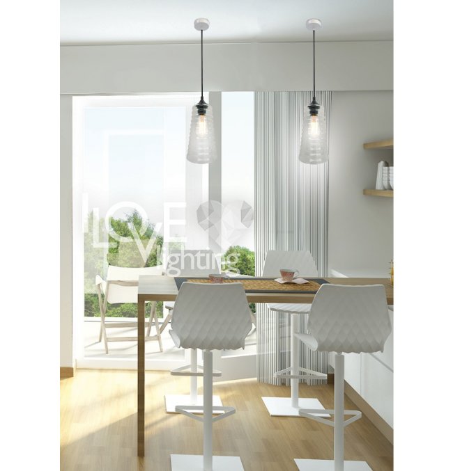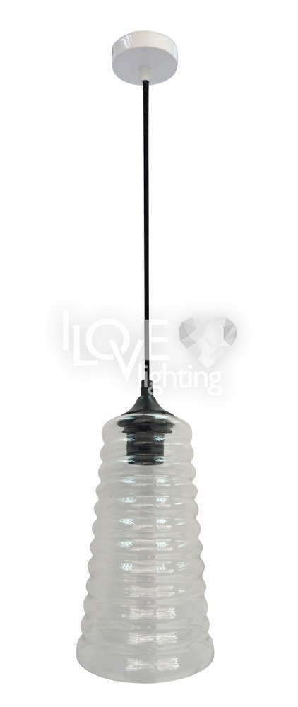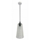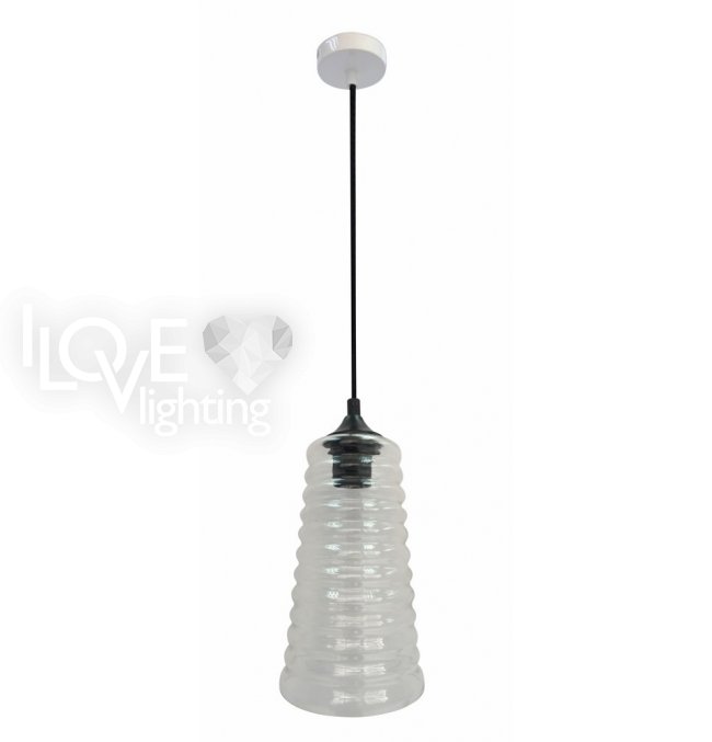 szklany klosz bezbarwny, zawieszony na czarnym prostym zawiesiu; stożkowa czarna nadkloszówka; doskonała dekoracja nad stół, bar czy ladę