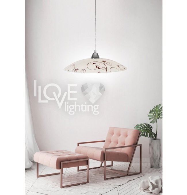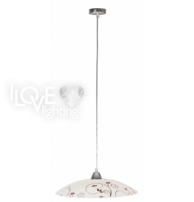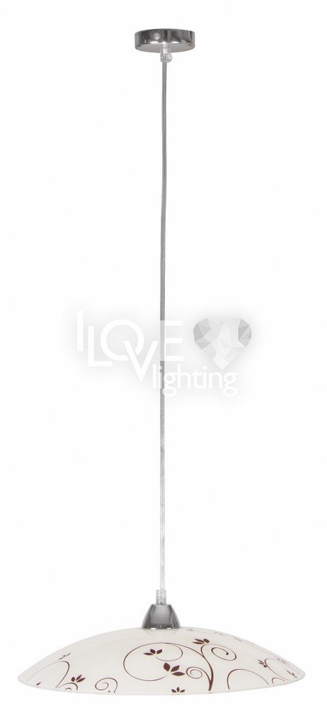 biały klosz ze szkła giętego, ozdobiony w kolorach ciemny brąz i srebrnym dekorem roślinnym, jeden z nielicznych - polerowany po stronie zewnętrznej; biały wewnątrz; efekt uzyskany w procesie produkcji poprzez piaskowanie, polerowanie i malowanie; zawieszony na zawiesiu z metalową nadkloszówką