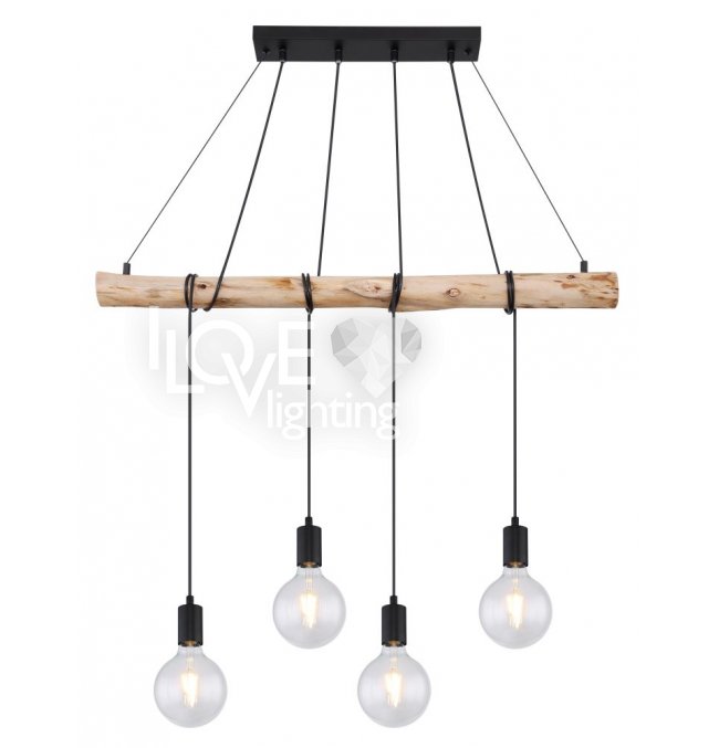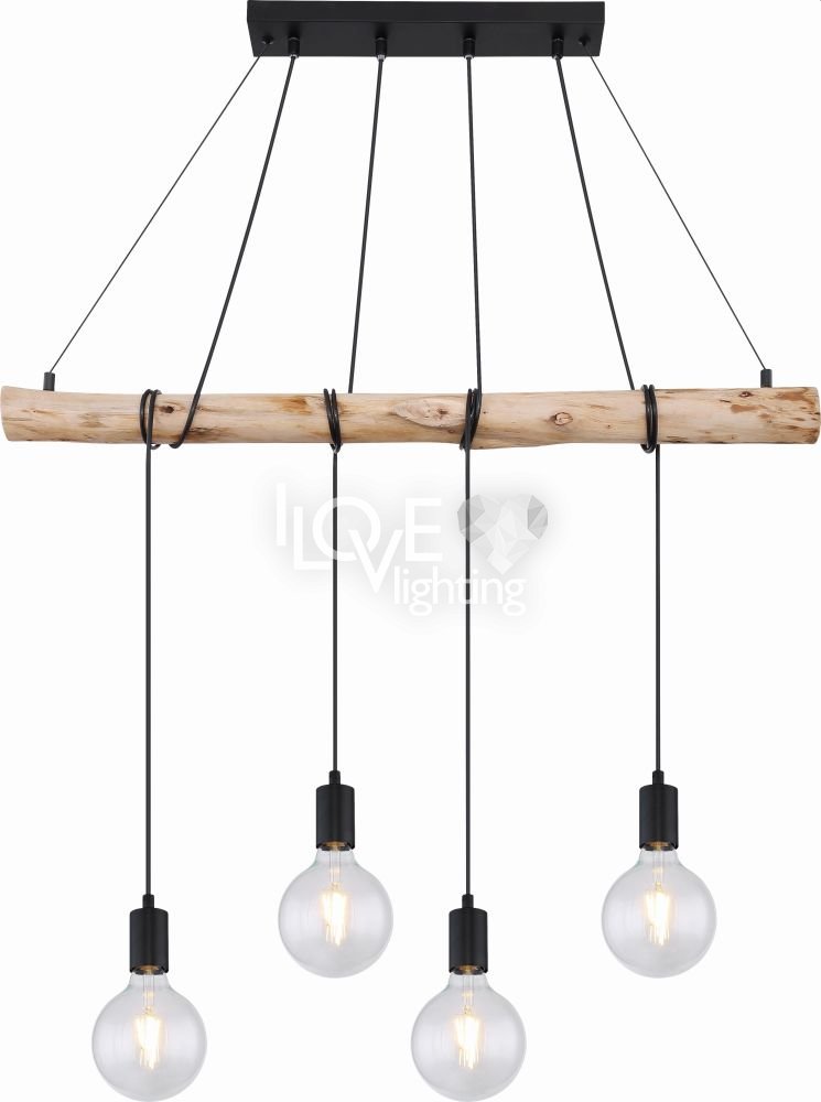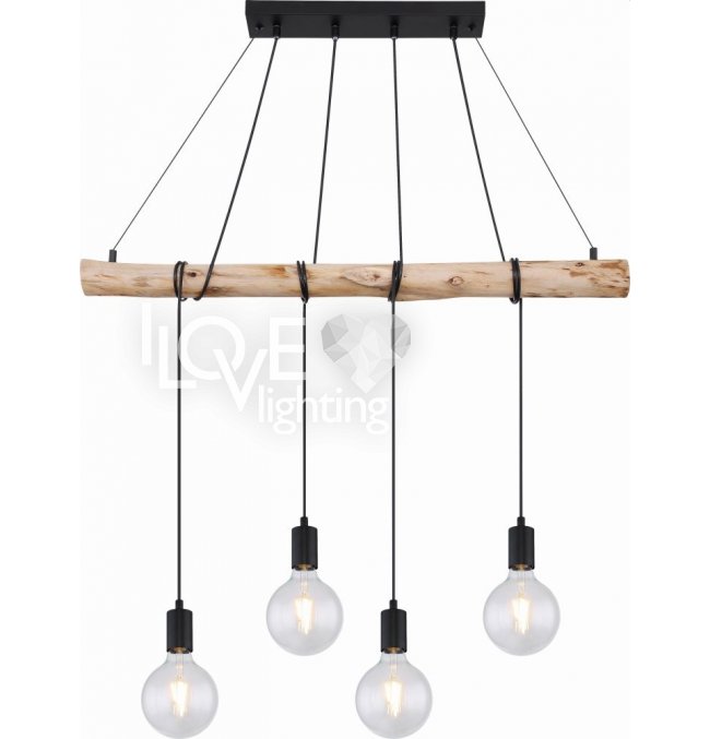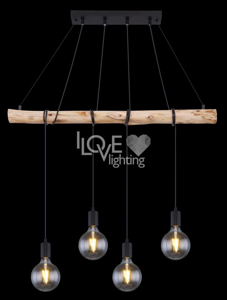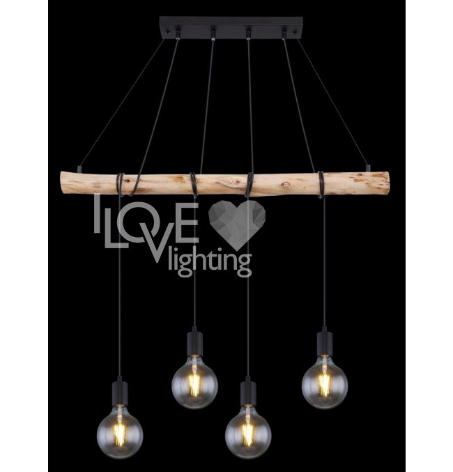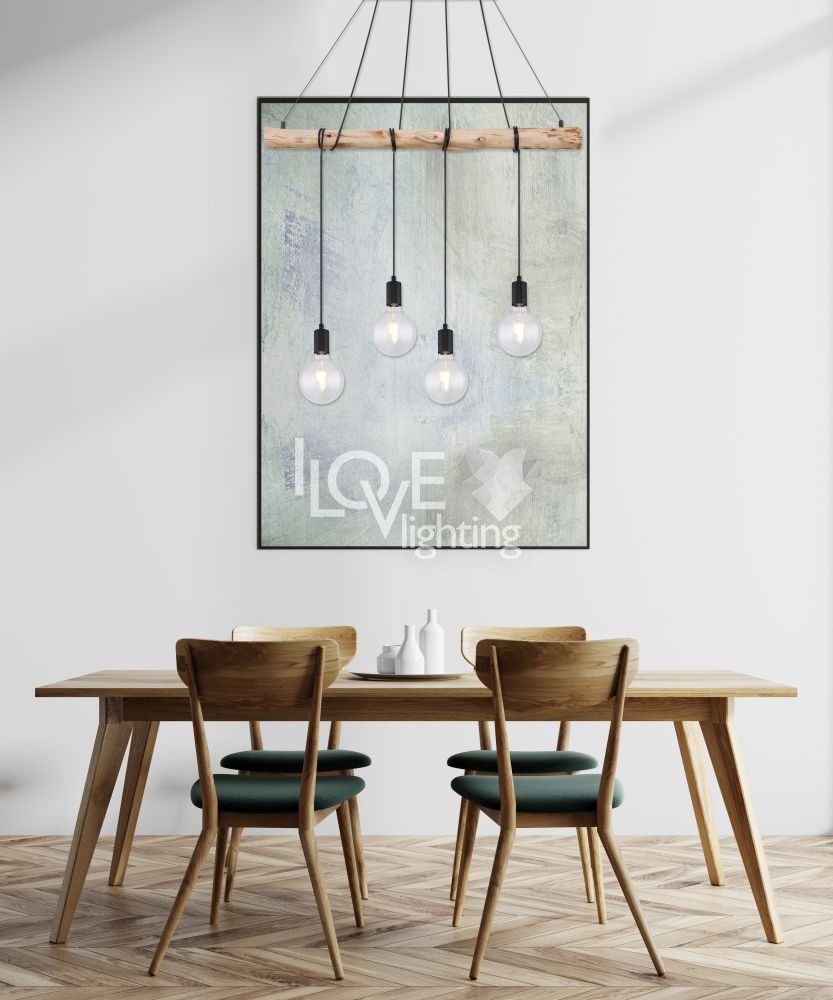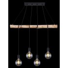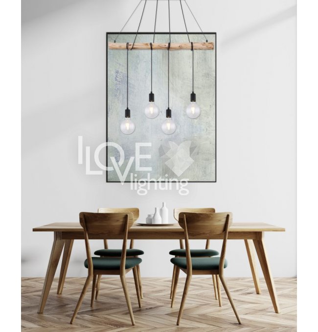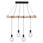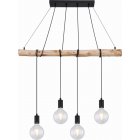 Lampa wisząca, metal czarny mat, drewno naturalne, kabel do owinięcia, Szer*Gł*Wys: 900*70*1200, nie zawiera żarówek 4xE27 60W 230V