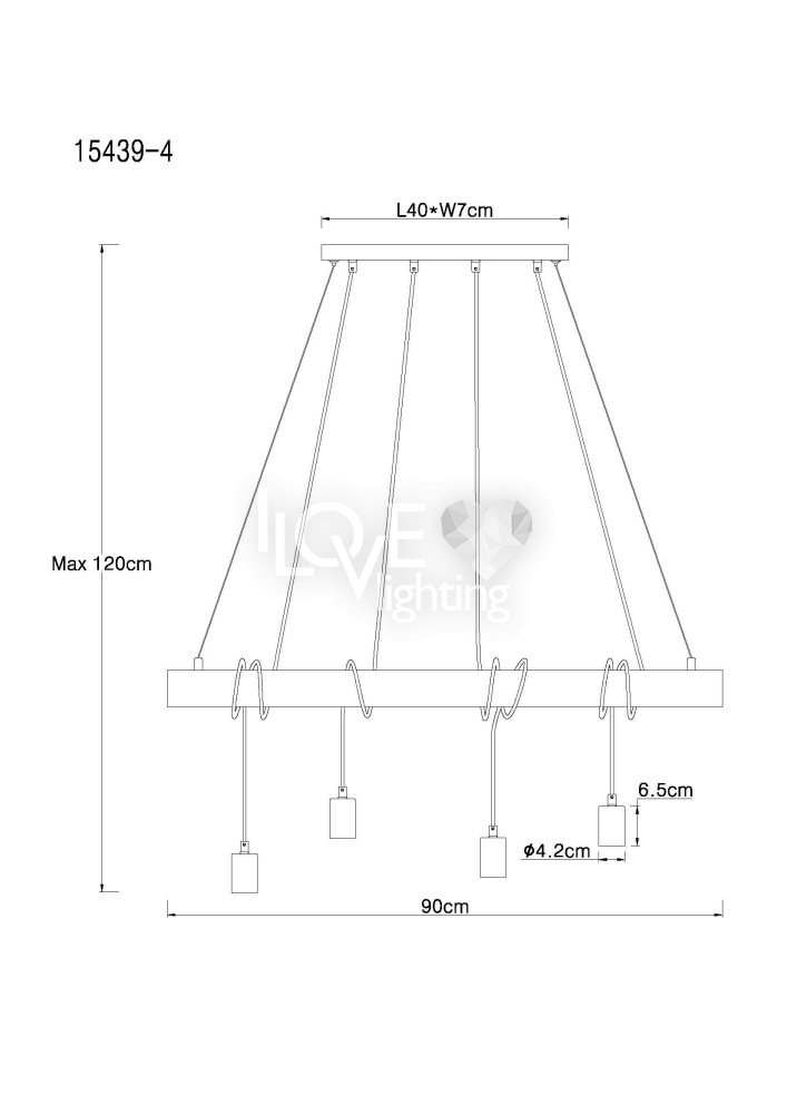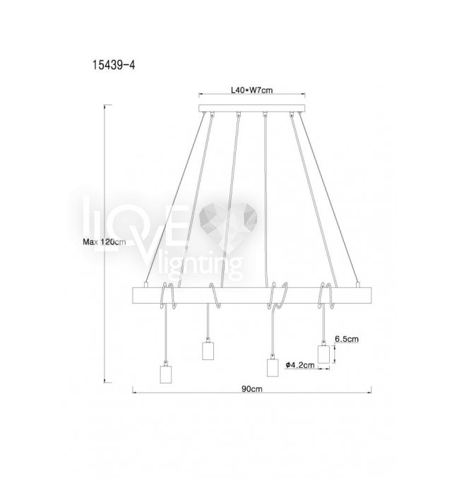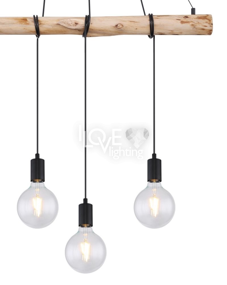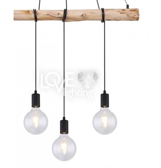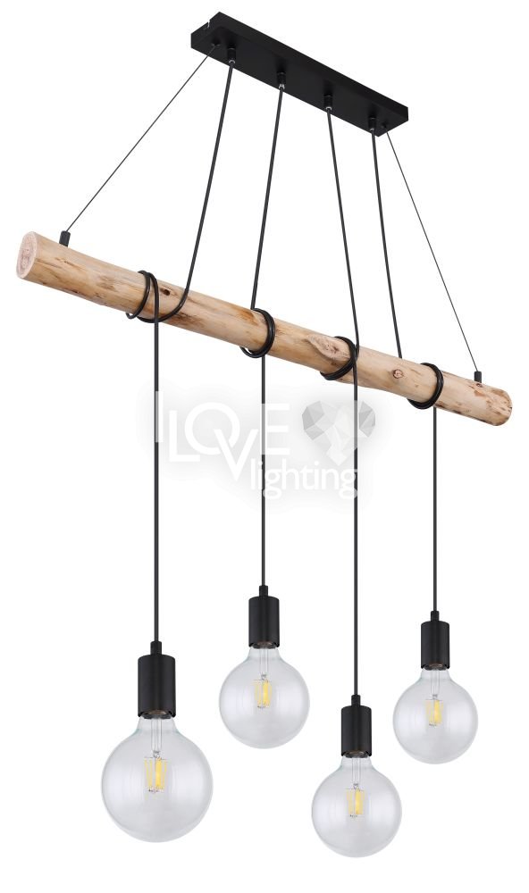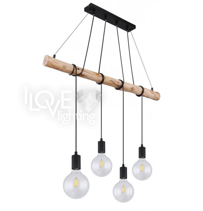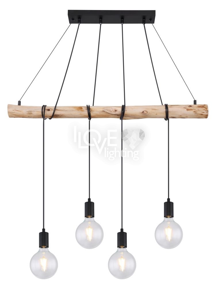 Lampa wisząca, metal czarny mat, drewno naturalne, kabel do owinięcia, Szer*Gł*Wys: 900*70*1200, nie zawiera żarówek 4xE27 60W 230V