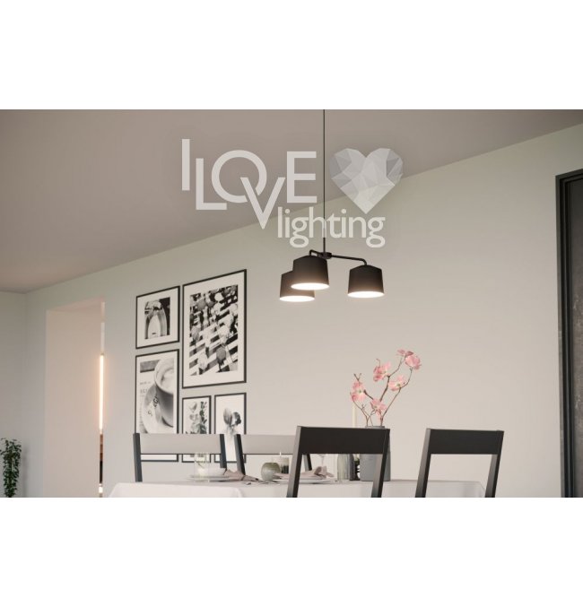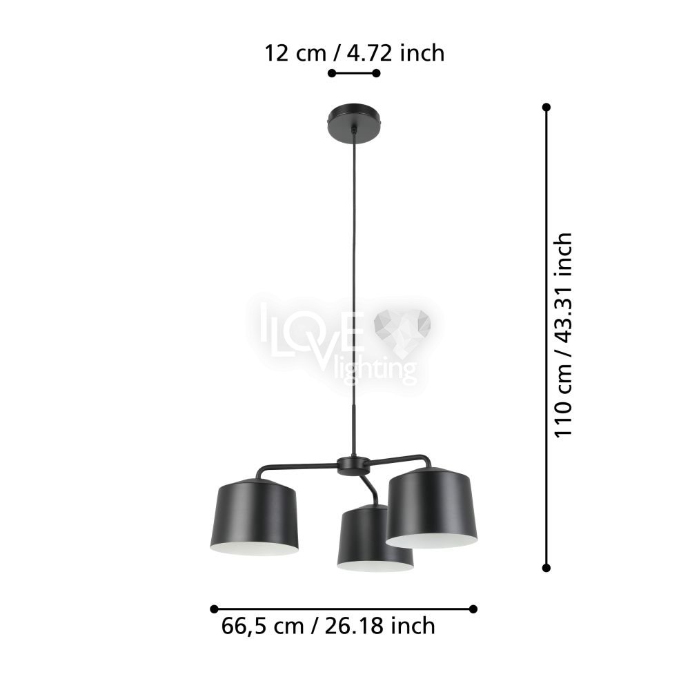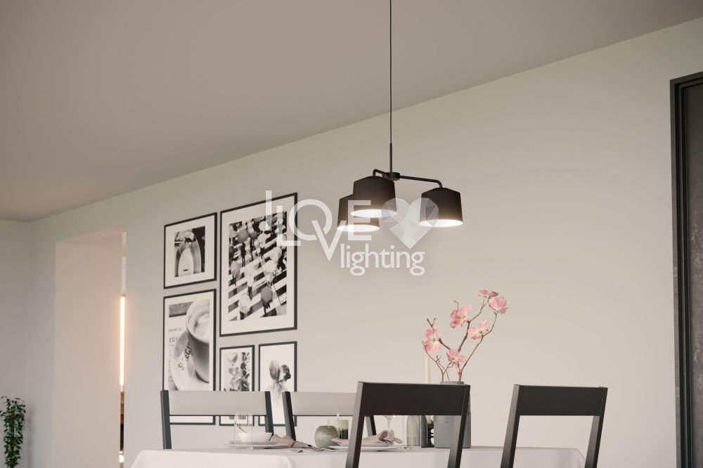 Lampa wisząca CAGUANES wykonana jest z trzech okrągłych kloszy z czarnej tkaniny z białym wnętrzem. Tekstylne klosze zawieszone są na okrągłym metalowym daszku tego samego koloru za pomocą czarnego tekstylnego kabla. Dzięki specjalnemu zawieszeniu przytulna lampa wisząca przypomina mobile i oferuje stylowe i nowoczesne oświetlenie w każdym pomieszczeniu - czy to w salonie, czy w jadalni nad stołem jadalnym. Żarówki nie wchodzą w zakres dostawy. Lampa nadaje się do każdej lampy z trzonkiem E27.