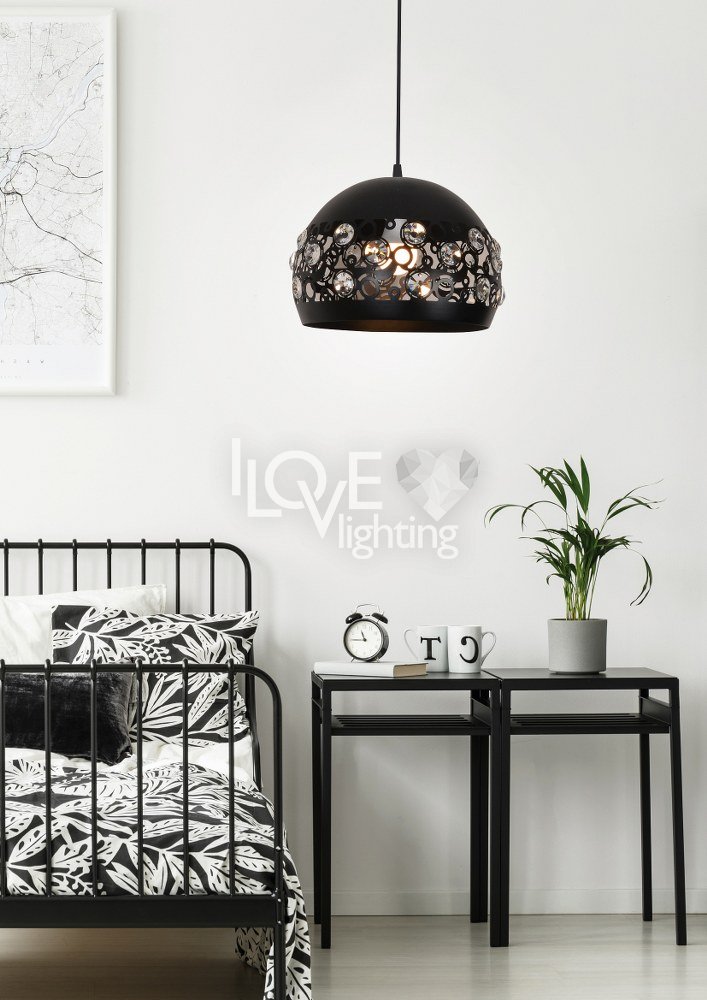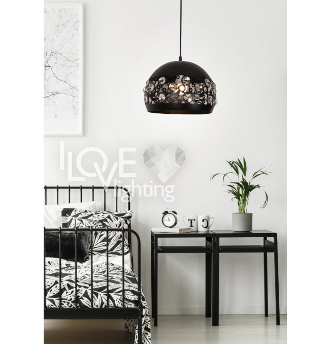 Zwisem JOLINA zachwyci się nawet hrabina! Elegancka czerń w matowym wykończeniu, oryginalny klosz metalowy kunsztownie zdobiony perforacją oraz kryształkami, które efektownie rozpraszają strumień światła; możliwość regulacji wysokości; jedyny w swoim rodzaju; doskonale sprawdzi się w kuchni i jadalni - atrakcyjnie wygląda w połączeniu 2-3szt zawieszonych w linii nad stołem;