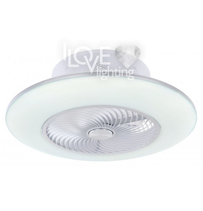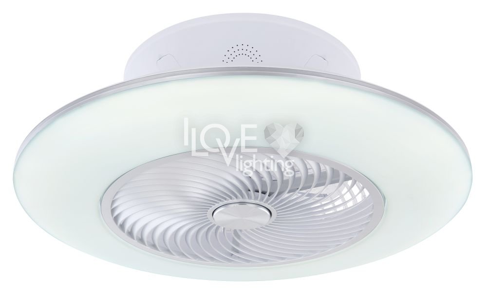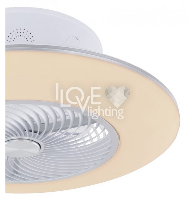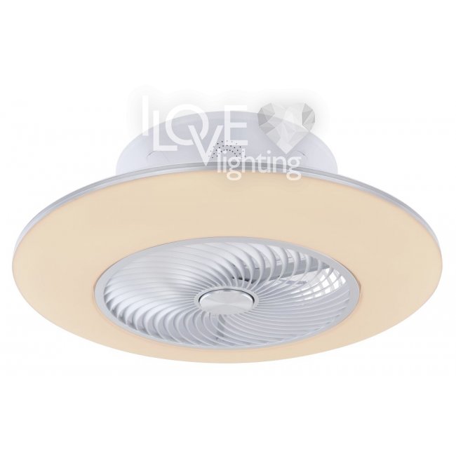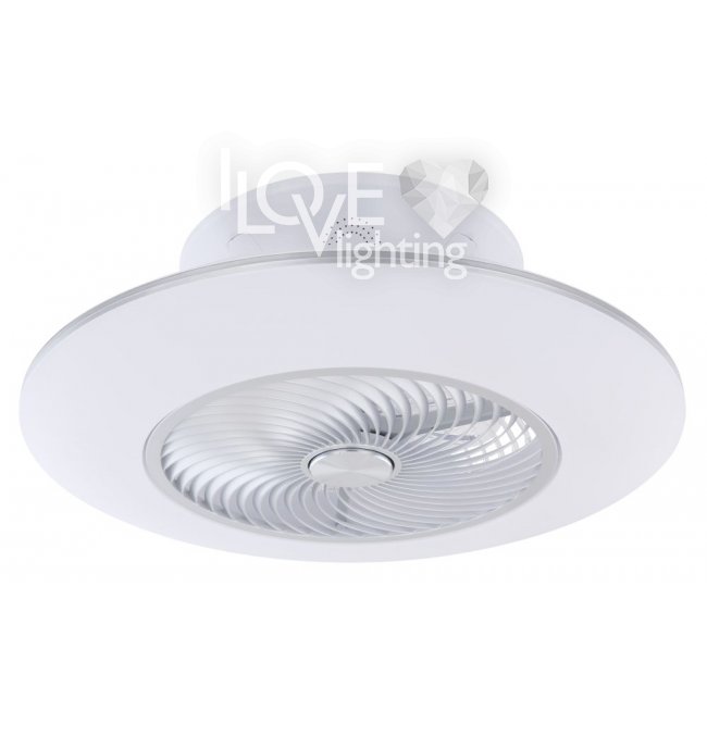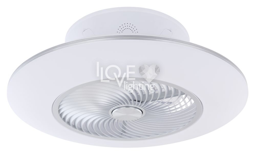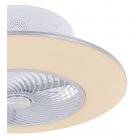 Wentylator sufitowy, matel biały i srebrny, akryl biały, motor 18W, szęść zakresów pracy, ustawienia czasu, pamięć ustawień, ośw. nocne, ściamniacz, zdalne sterowanie, zmiana barwy światła, ? 580, Wys: 220, 1xLED 40W 230V, 4000lm źródło, 1900lm na wyj, CCT 3000-6000K