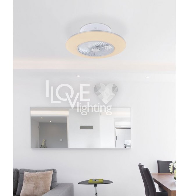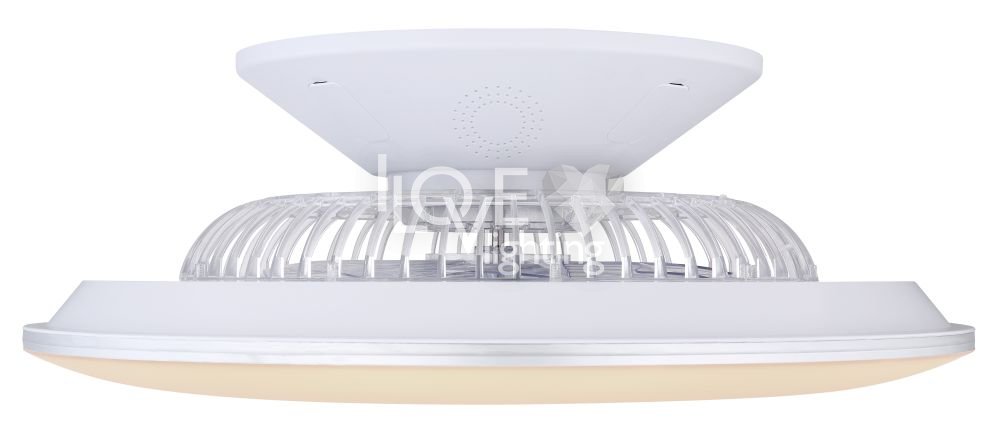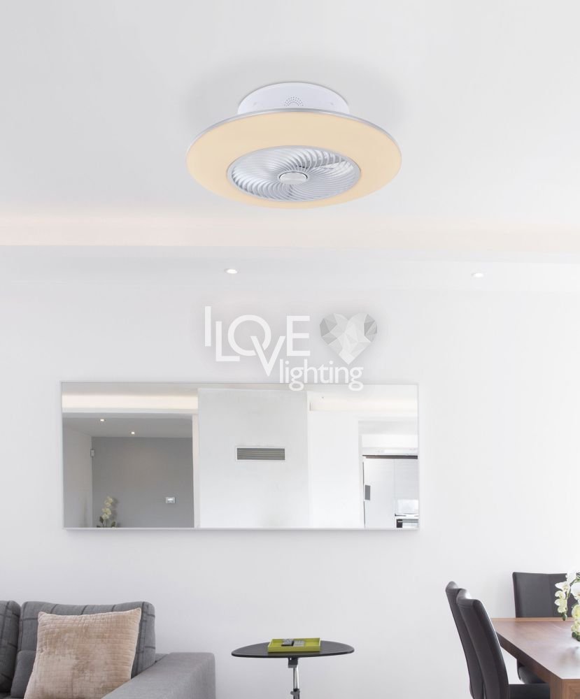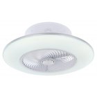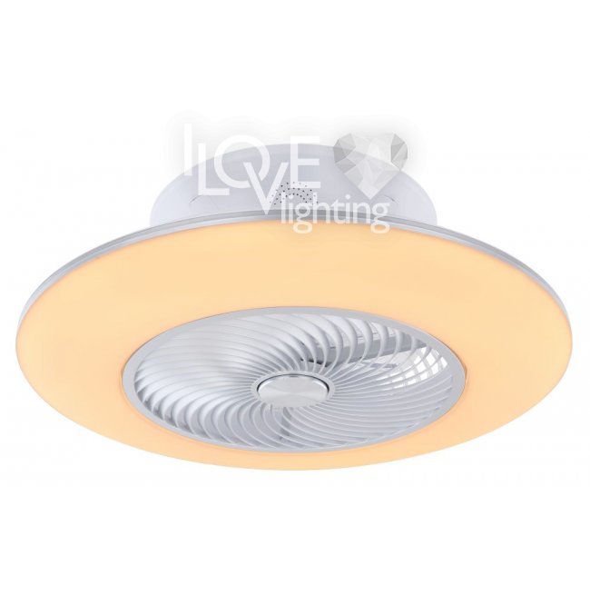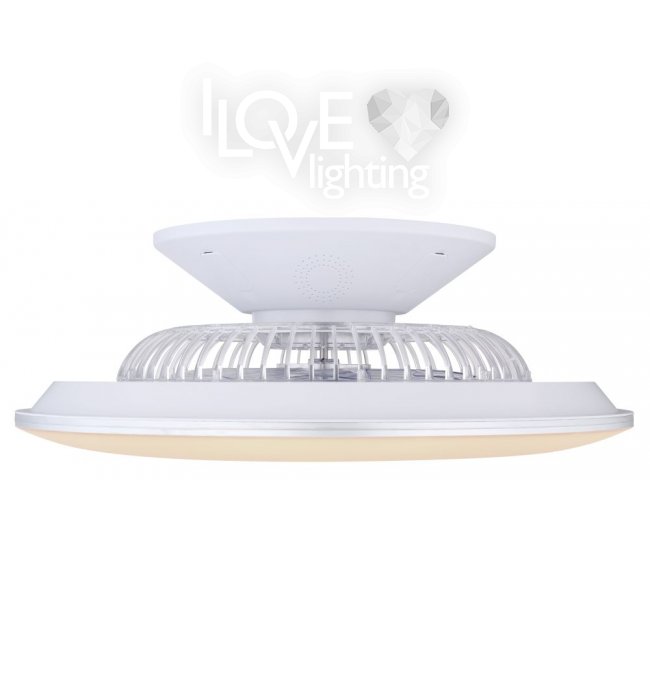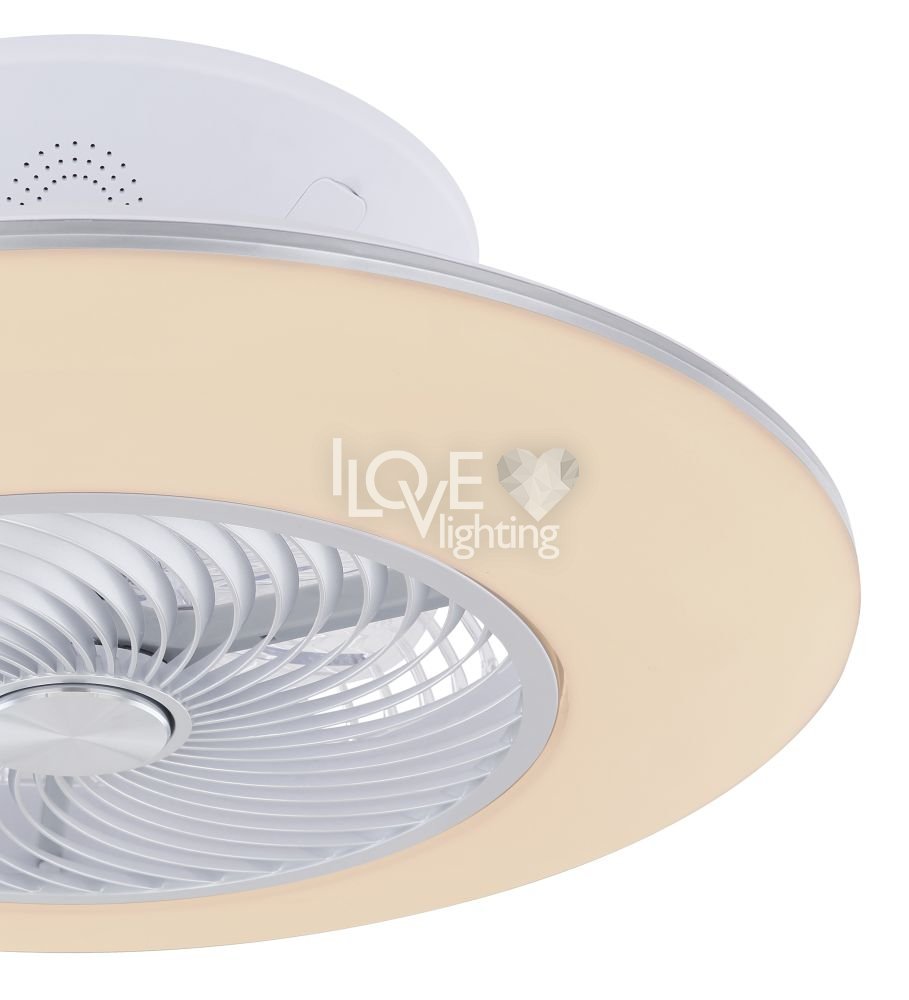 Wentylator sufitowy, matel biały i srebrny, akryl biały, motor 18W, szęść zakresów pracy, ustawienia czasu, pamięć ustawień, ośw. nocne, ściamniacz, zdalne sterowanie, zmiana barwy światła, ? 580, Wys: 220, 1xLED 40W 230V, 4000lm źródło, 1900lm na wyj, CCT 3000-6000K